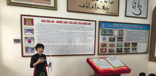 Tại đây, các em được chính cô Vũ Thanh Tiến- Hiệu trưởng trường THCS Chu Văn An, một nhà giáo tài năng, tâm huyết với mái trường giới thiệu về truyền thống đáng tự hào của thầy và trò trường THCS Chu Văn An.