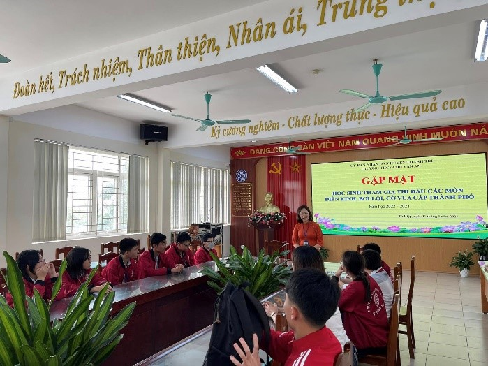 Trường THCS Chu Văn An đã tạo điều kiện và tích cực tuyển chọn học sinh tham gia luyện tập và thi đấu các bộ môn: Cờ vua, bơi lội và điền kinh. Để động viên, khích lệ các vận động viên tham gia giải thi đấu ở các nội dung, vào sáng ngày 11 tháng 3 năm 2023, tại phòng Hội đồng trường THCS Chu Văn An đã diễn ra buổi gặp mặt của ban Lãnh đạo nhà trường với các bạn học sinh.