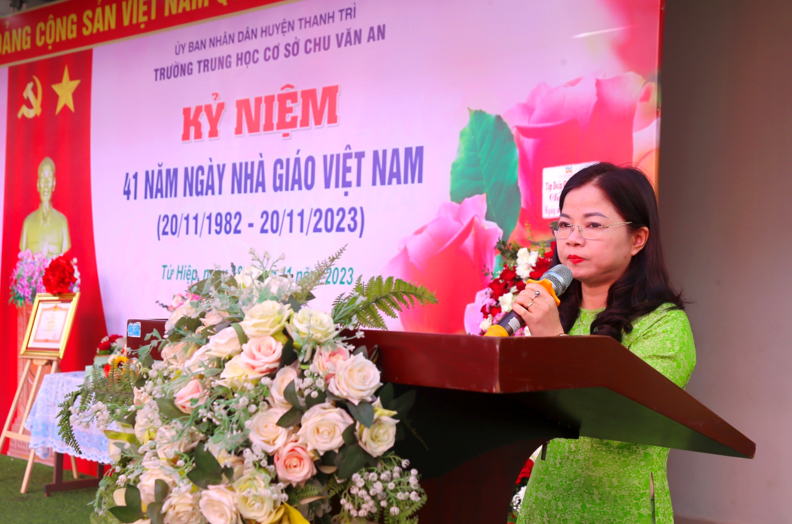 Sau một số tiết mục văn nghệ mở đầu là bài phát biểu của cô giáo Nguyễn Thị Hồng Thịnh – Bí thư chi bộ, Hiệu trưởng nhà trường, về ý nghĩa của ngày nhà giáo Việt Nam, ôn lại truyền thống “Tôn sư trọng đạo” và báo cáo những thành tích đã đạt được trong phong trào thi đua chào mừng ngày nhà giáoViệt Nam của thầy và trò nhà trường. Cô cũng cảm ơn các ban ngành đoàn thể, các bậc phụ huynh đã gửi những bó hoa tươi thắm đến chúc mừng ngày của ngành – ngày nhà giáo Việt nam 20/11. Và đây cũng là dịp để các thế hệ học trò, các em học sinh bày tỏ lòng biết ơn đến thầy giáo, cô giáo. Thay mặt cho học sinh trường THCS Chu Văn An, em Nguyễn Thị Mai Anh - học sinh lớp 8A4 đã có bài phát biểu đầy xúc động, gửi lời cảm ơn sâu sắc đến các thầy cô giáo nhân dịp đặc biệt này.