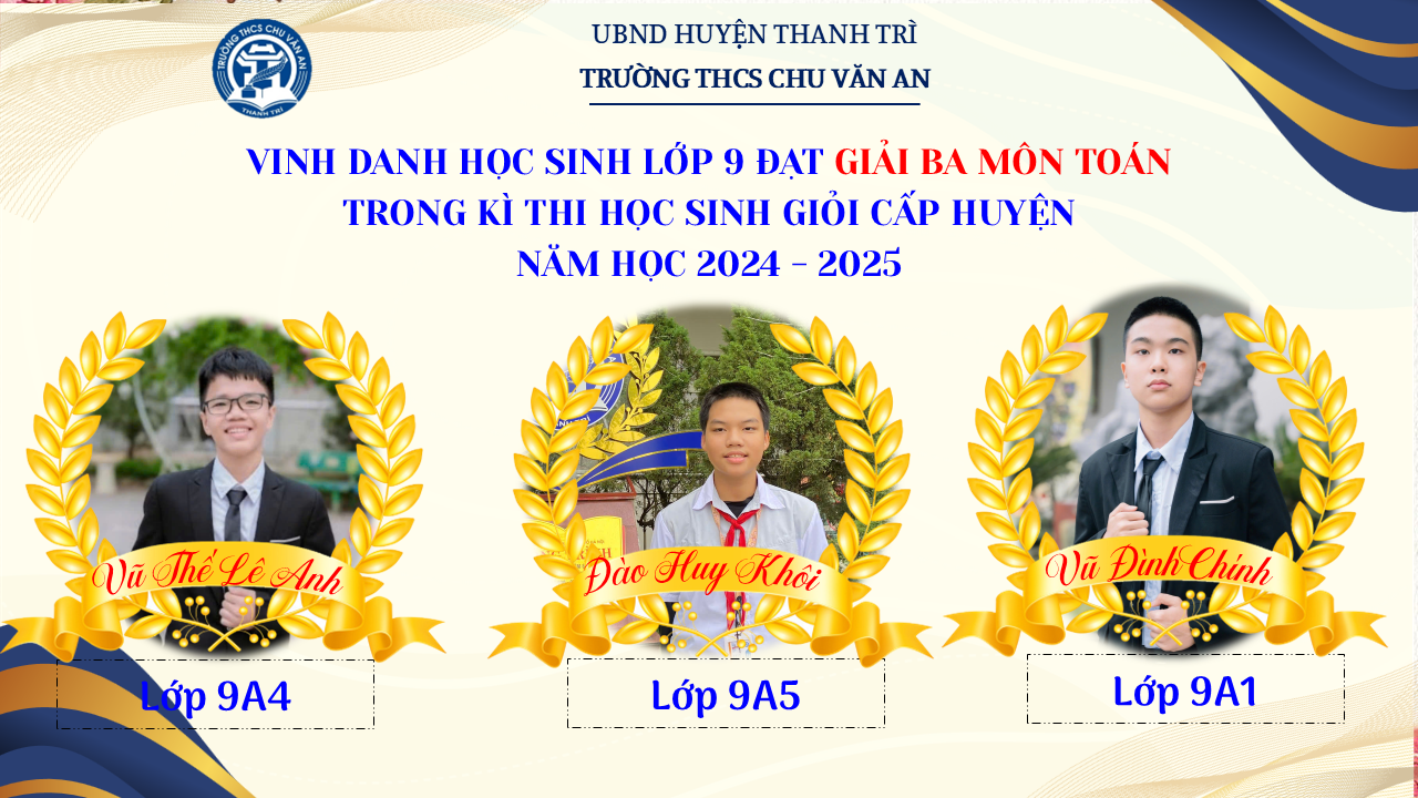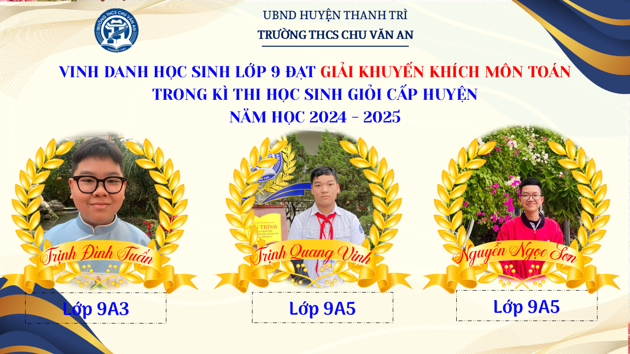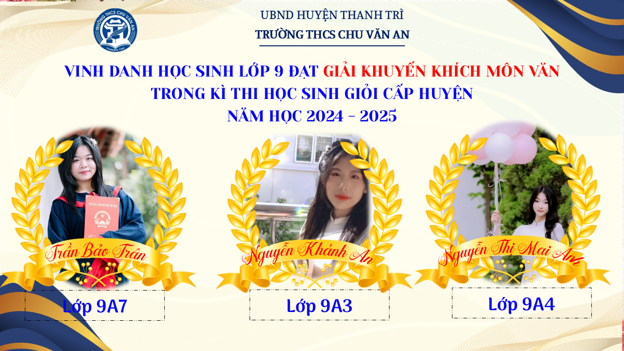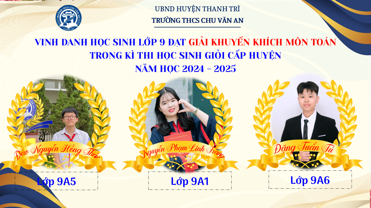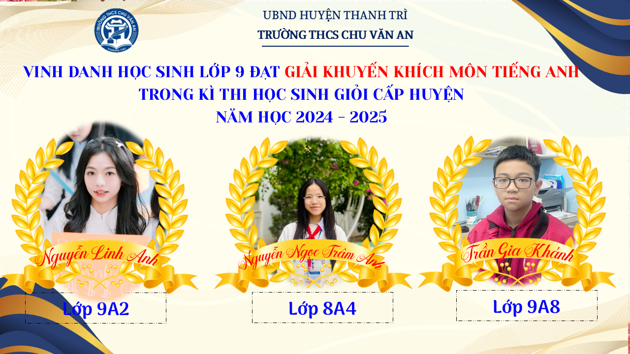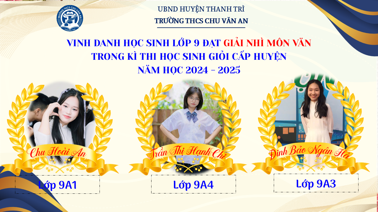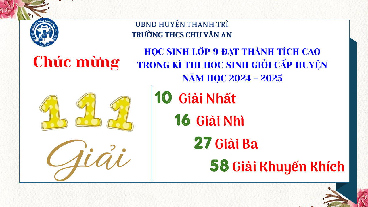 Thật vinh dự khi được chúc mừng 111 học sinh trường THCS Chu Văn An đã xuất sắc đạt giải cao trong kỳ thi học sinh giỏi lớp 9 cấp huyện năm học 2024-2025! 🎉 Thành tích này là kết quả của sự nỗ lực không ngừng nghỉ, lòng say mê học tập và tinh thần quyết tâm của các em; là vụ mùa bội thu dành tặng những người làm vườn cần mẫn trên mảnh vườn tri thức; là món quà dành tặng mẹ cha.