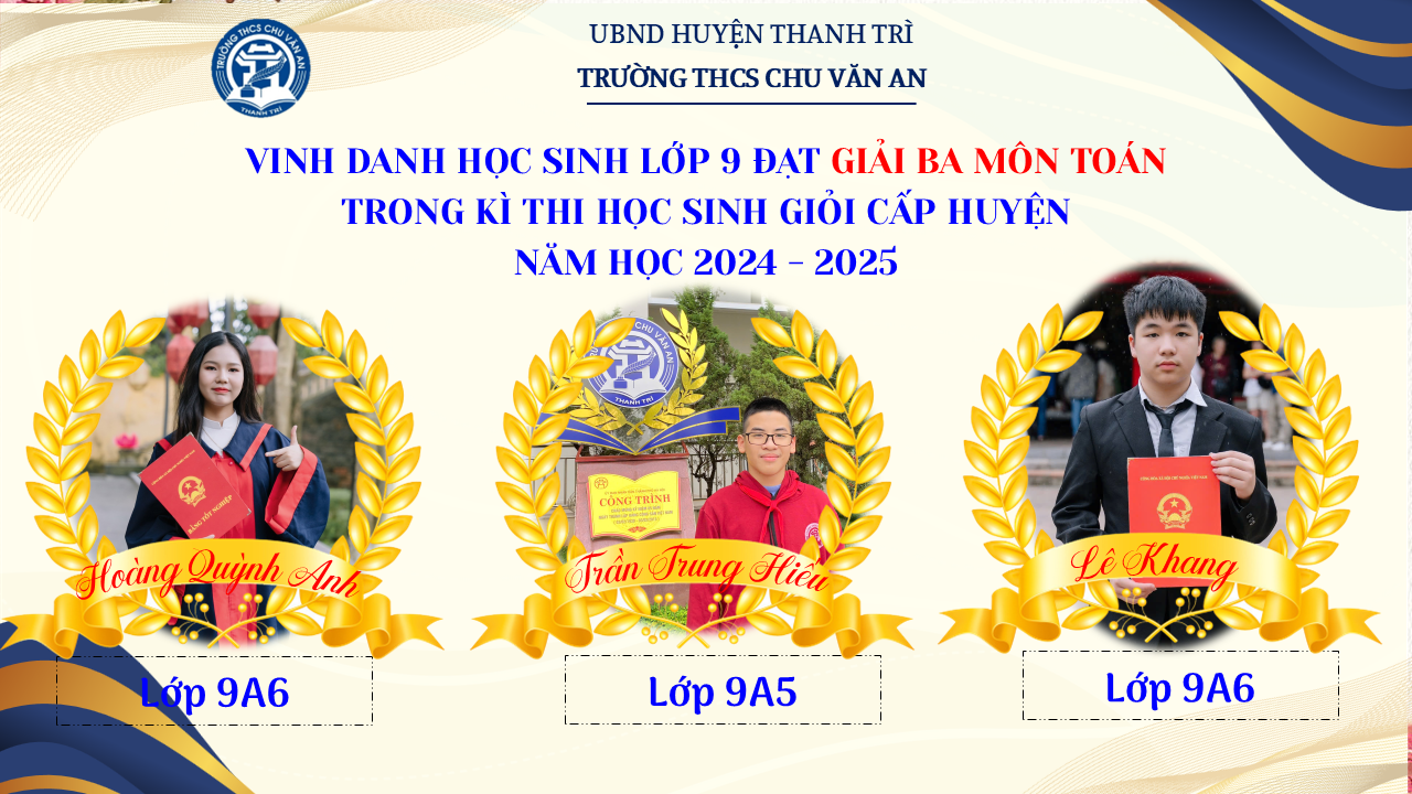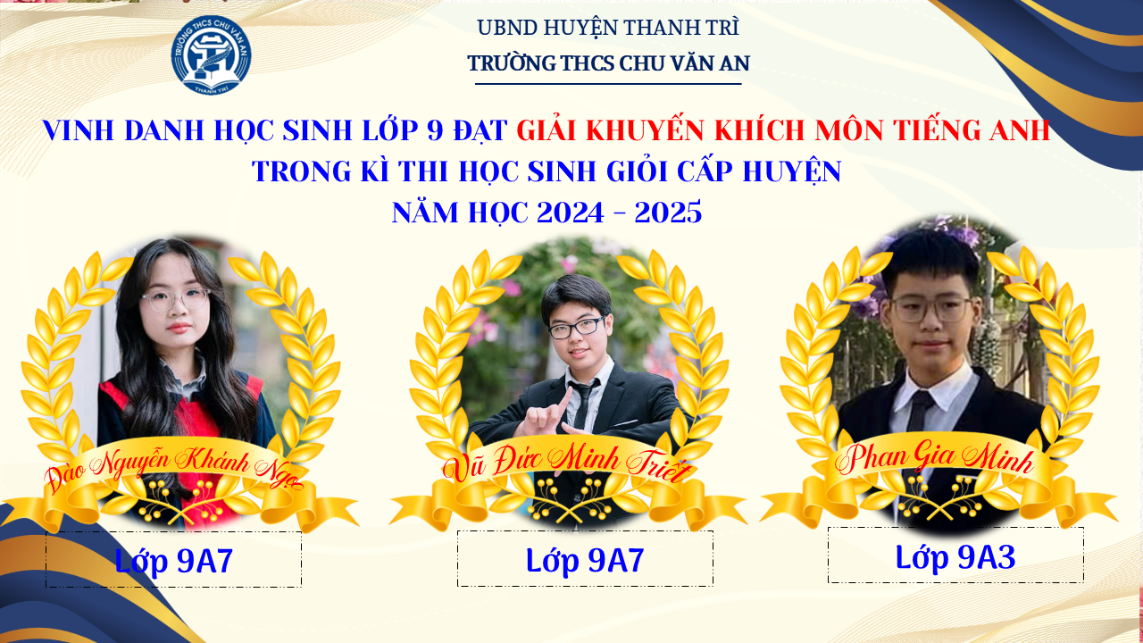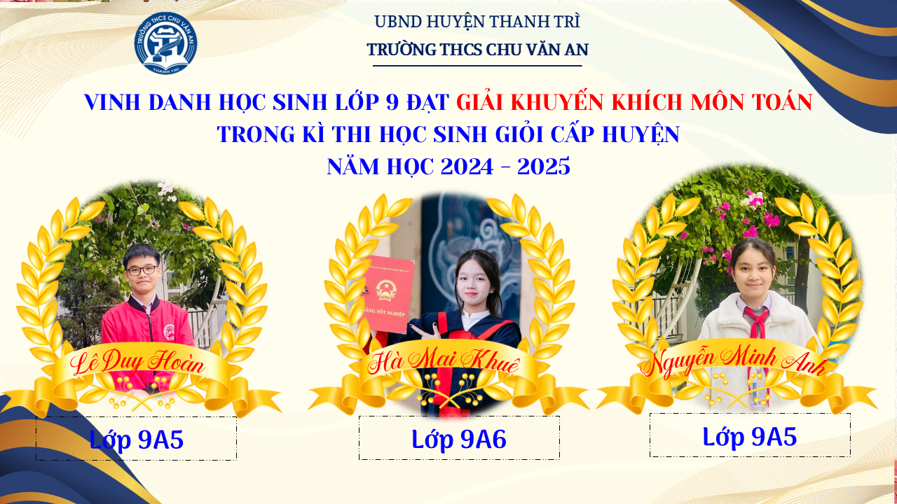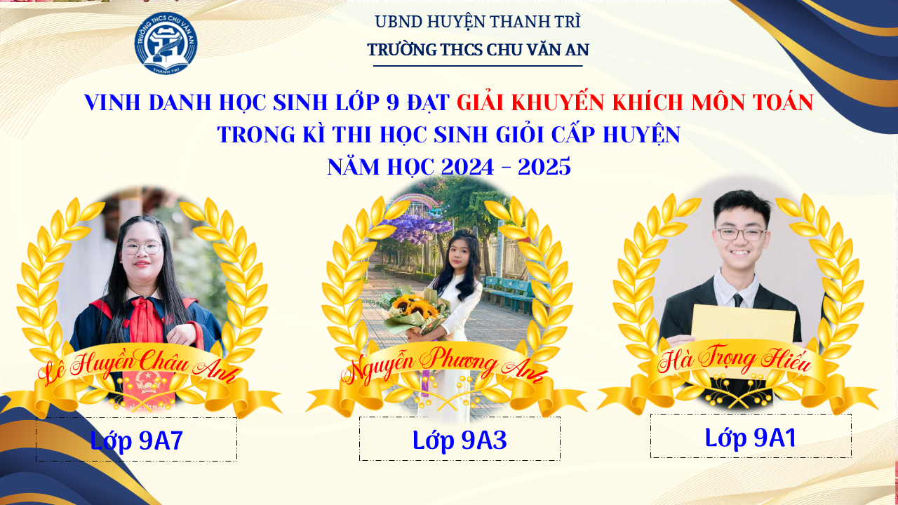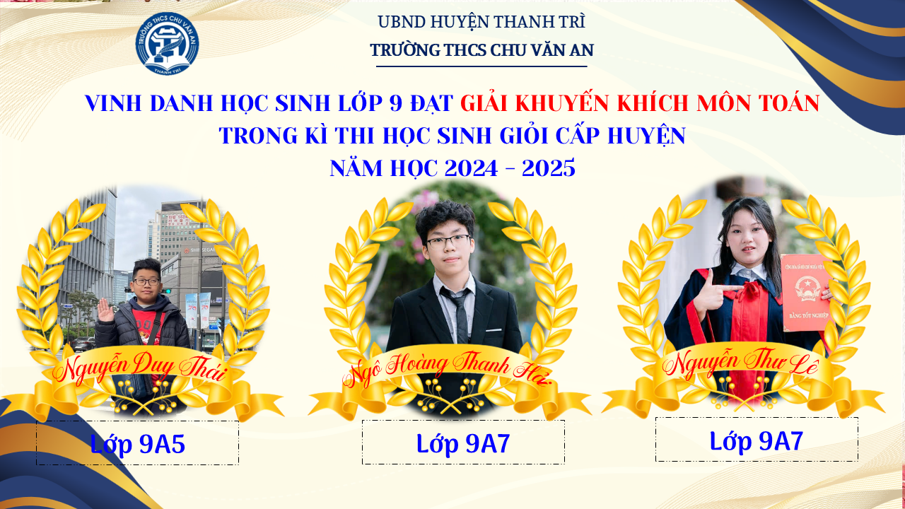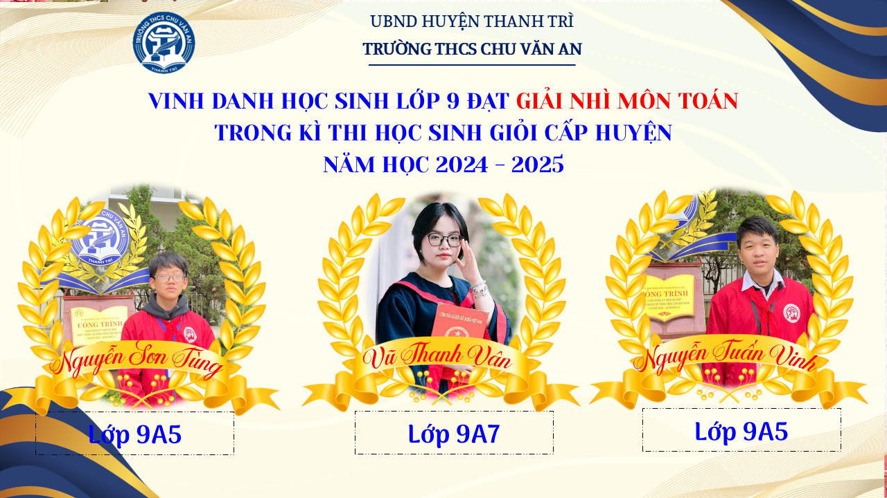 Thật vinh dự khi được chúc mừng 111 học sinh trường THCS Chu Văn An đã xuất sắc đạt giải cao trong kỳ thi học sinh giỏi lớp 9 cấp huyện năm học 2024-2025! 🎉 Thành tích này là kết quả của sự nỗ lực không ngừng nghỉ, lòng say mê học tập và tinh thần quyết tâm của các em; là vụ mùa bội thu dành tặng những người làm vườn cần mẫn trên mảnh vườn tri thức; là món quà dành tặng mẹ cha.