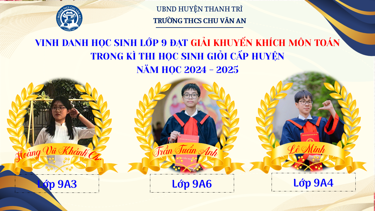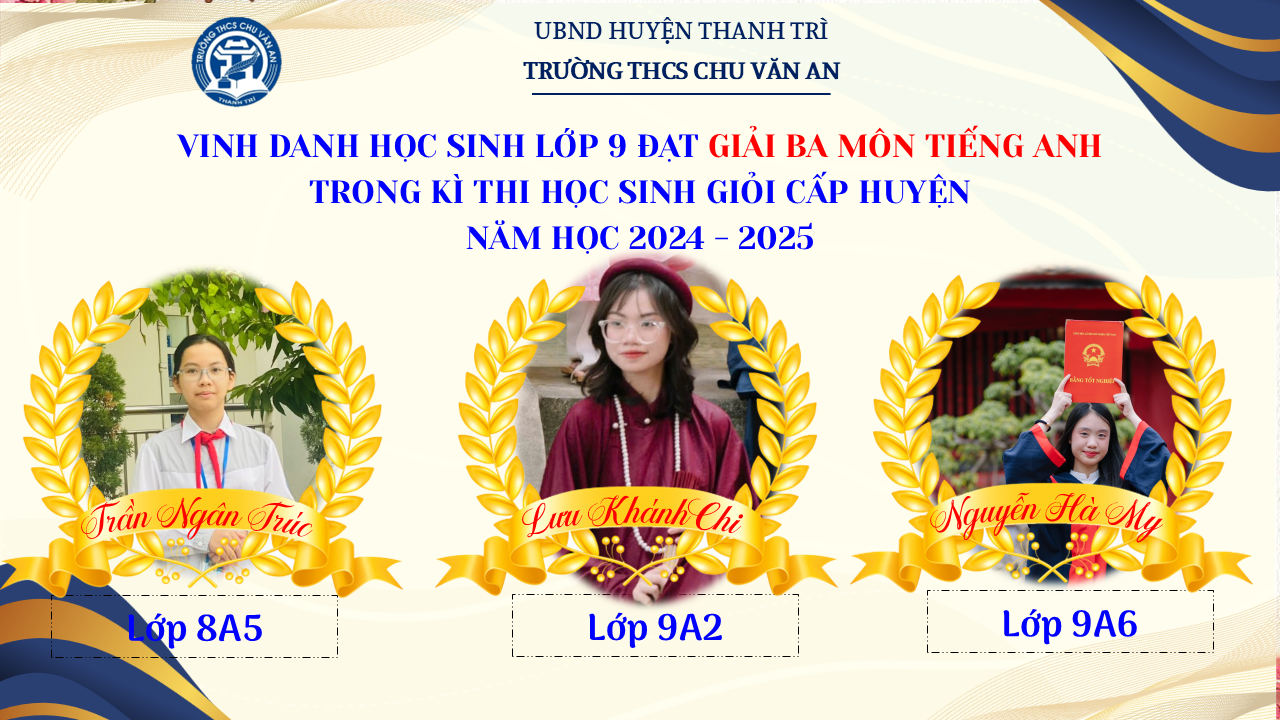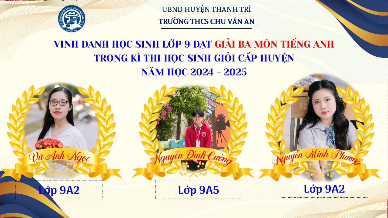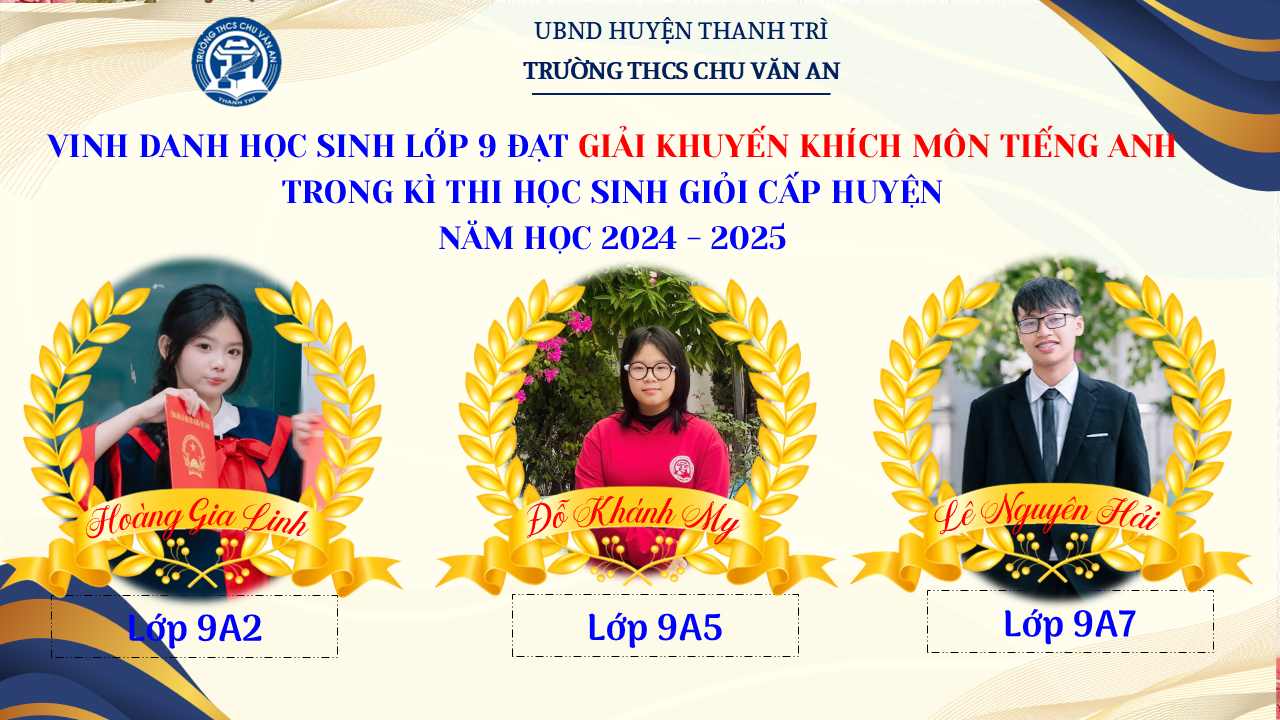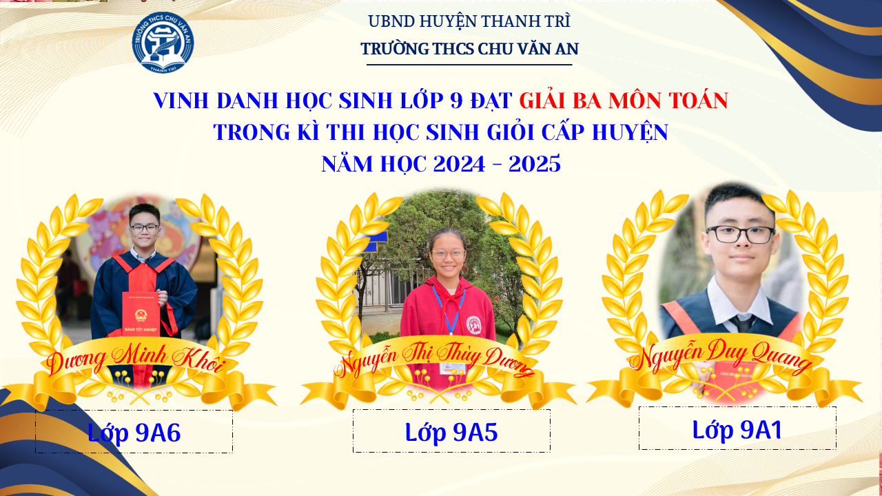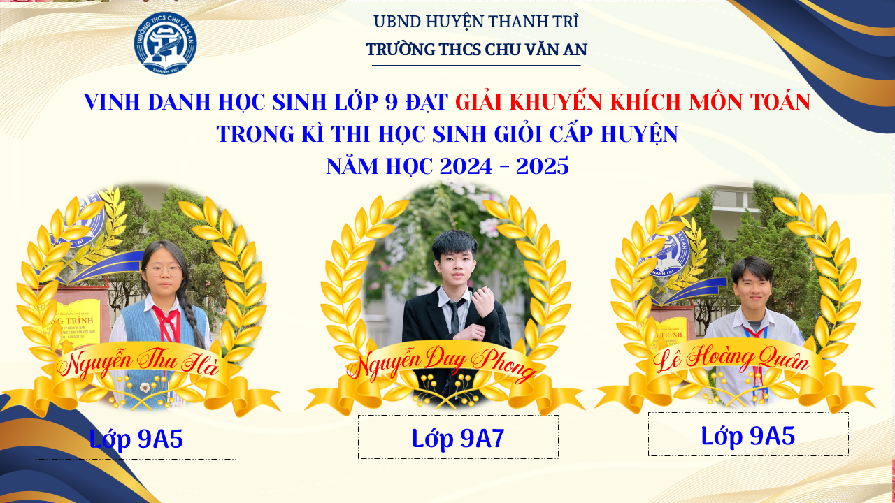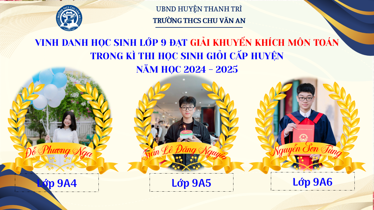 Thật vinh dự khi được chúc mừng 111 học sinh trường THCS Chu Văn An đã xuất sắc đạt giải cao trong kỳ thi học sinh giỏi lớp 9 cấp huyện năm học 2024-2025! 🎉 Thành tích này là kết quả của sự nỗ lực không ngừng nghỉ, lòng say mê học tập và tinh thần quyết tâm của các em; là vụ mùa bội thu dành tặng những người làm vườn cần mẫn trên mảnh vườn tri thức; là món quà dành tặng mẹ cha.