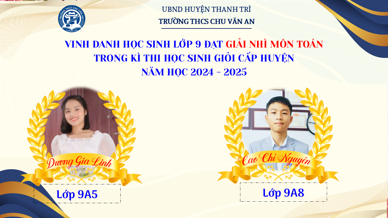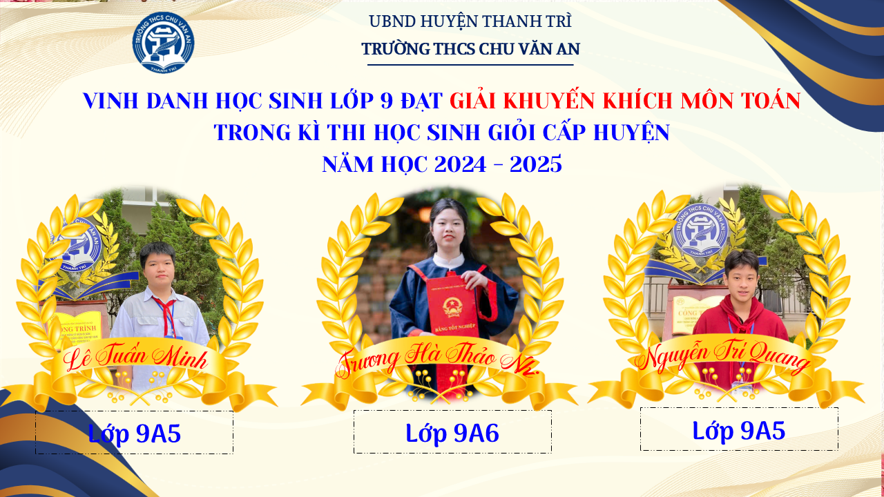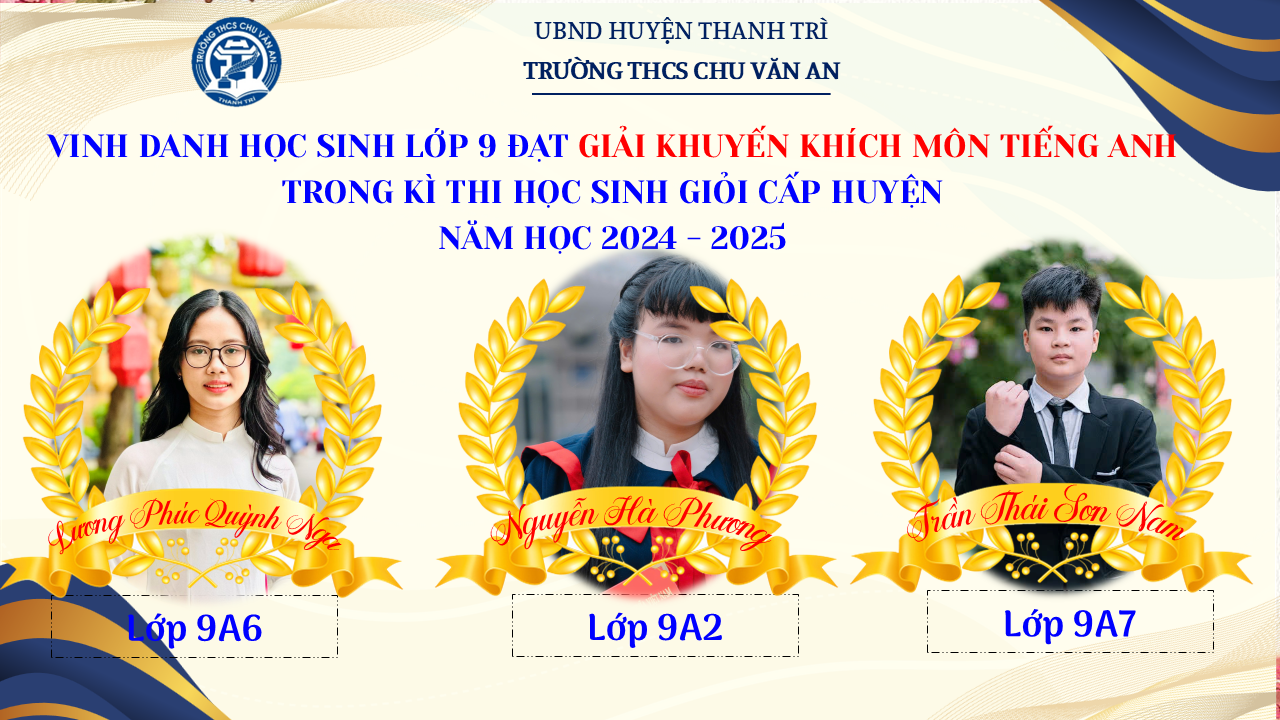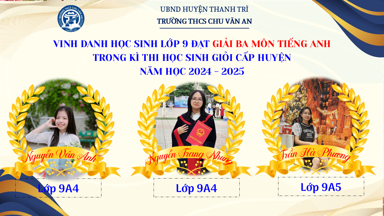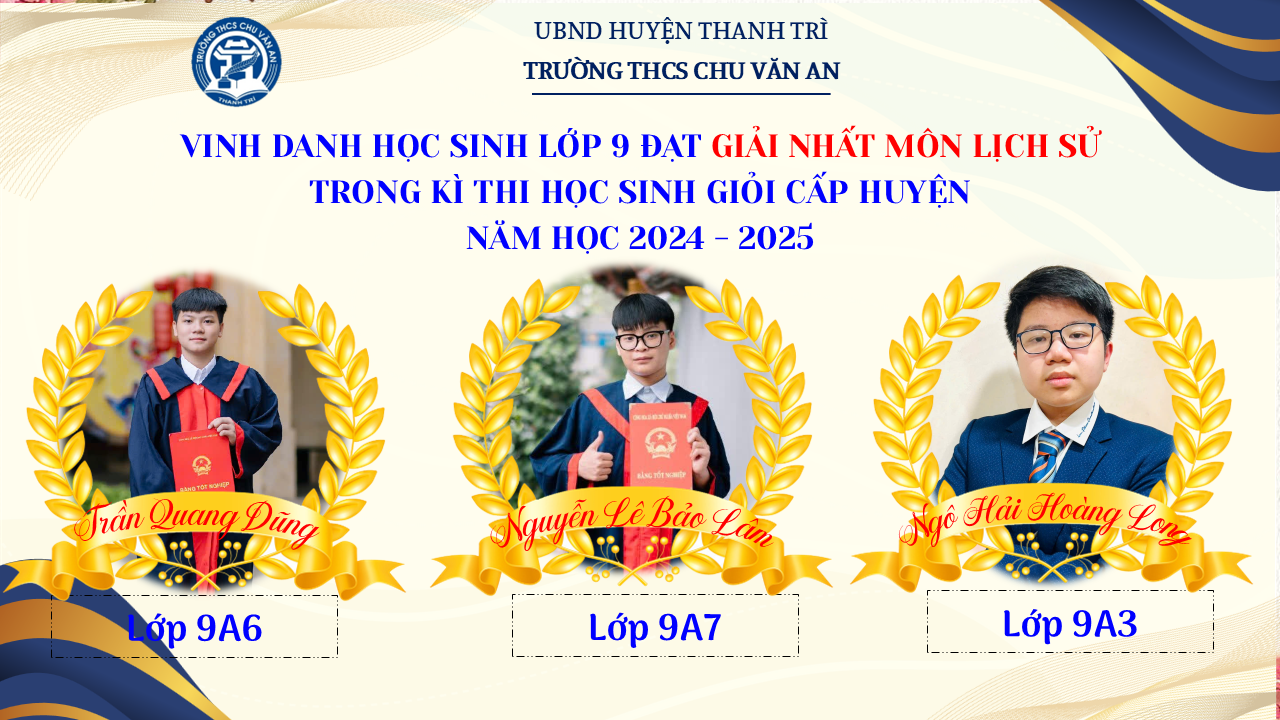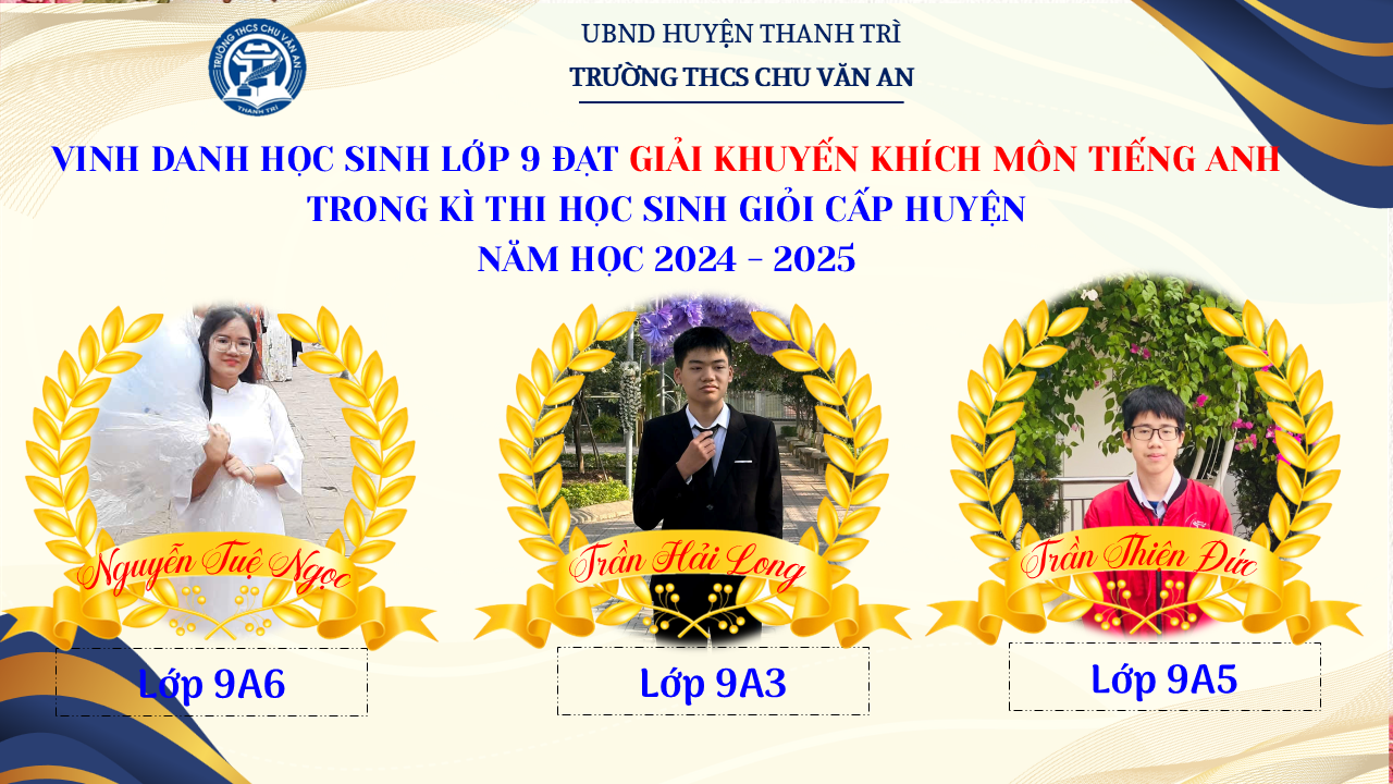 Thật vinh dự khi được chúc mừng 111 học sinh trường THCS Chu Văn An đã xuất sắc đạt giải cao trong kỳ thi học sinh giỏi lớp 9 cấp huyện năm học 2024-2025! 🎉 Thành tích này là kết quả của sự nỗ lực không ngừng nghỉ, lòng say mê học tập và tinh thần quyết tâm của các em; là vụ mùa bội thu dành tặng những người làm vườn cần mẫn trên mảnh vườn tri thức; là món quà dành tặng mẹ cha.