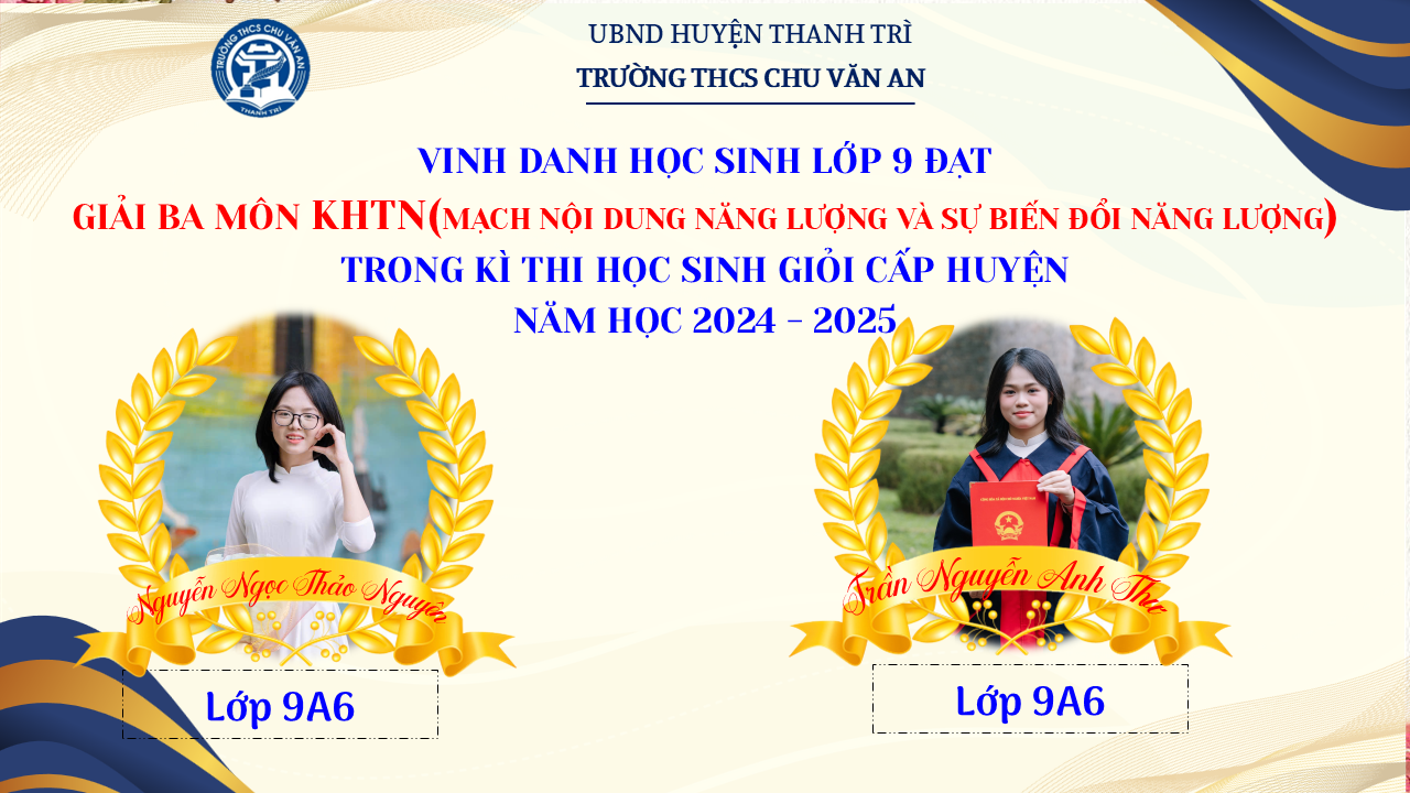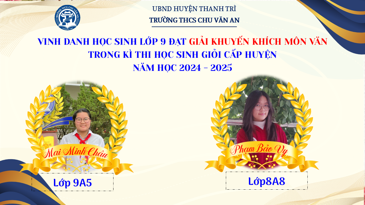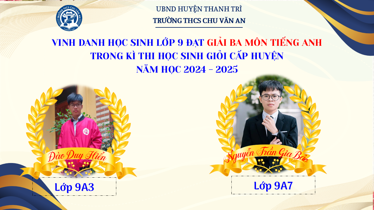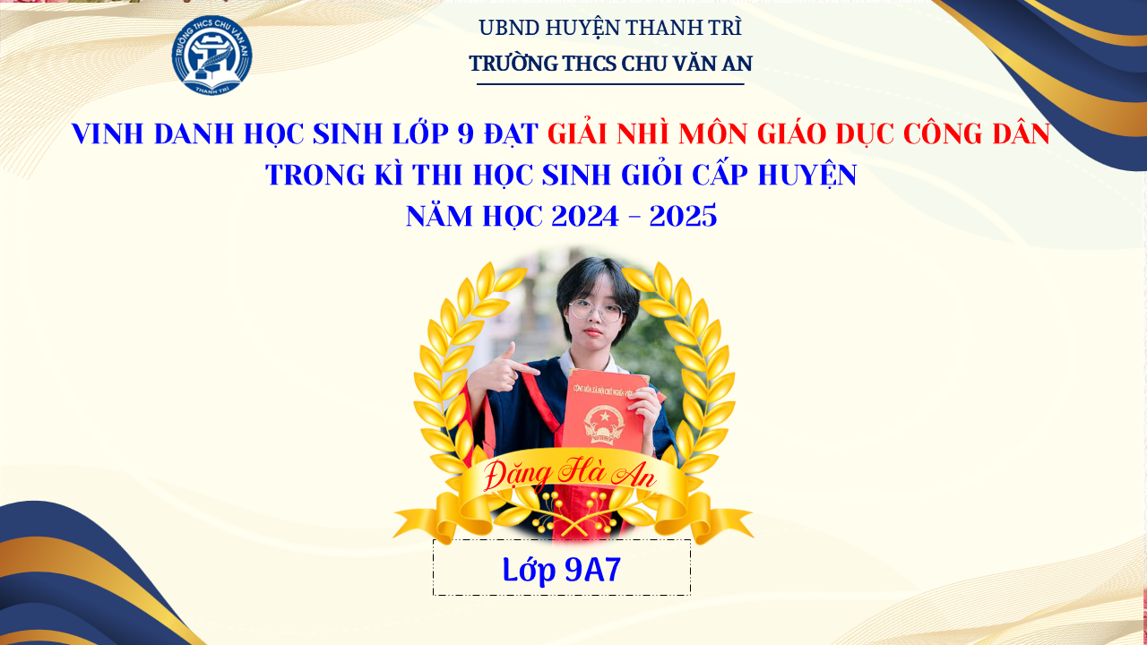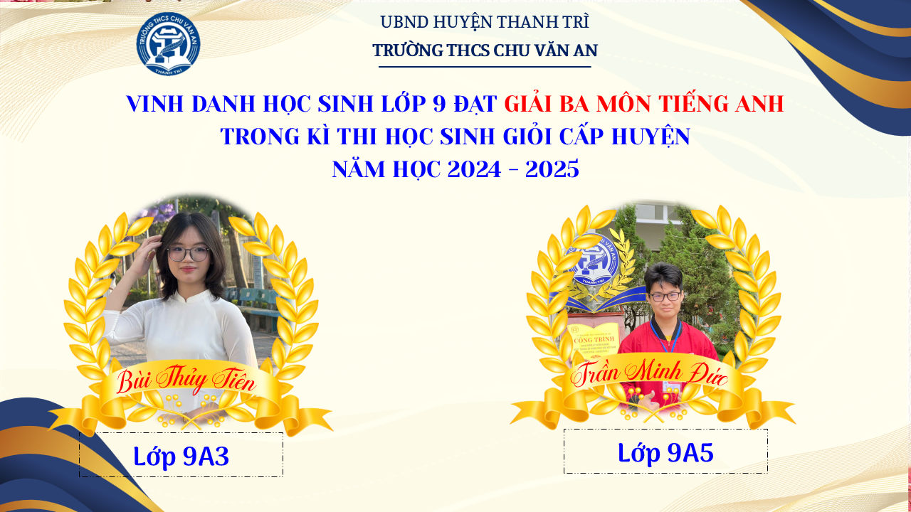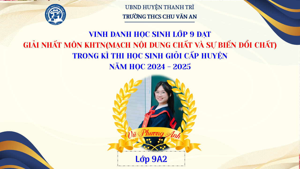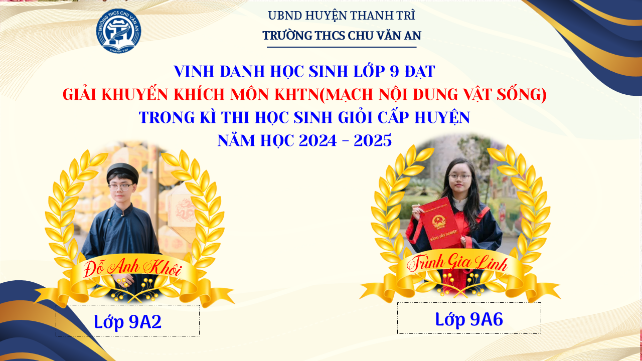 Thật vinh dự khi được chúc mừng 111 học sinh trường THCS Chu Văn An đã xuất sắc đạt giải cao trong kỳ thi học sinh giỏi lớp 9 cấp huyện năm học 2024-2025! 🎉 Thành tích này là kết quả của sự nỗ lực không ngừng nghỉ, lòng say mê học tập và tinh thần quyết tâm của các em; là vụ mùa bội thu dành tặng những người làm vườn cần mẫn trên mảnh vườn tri thức; là món quà dành tặng mẹ cha.