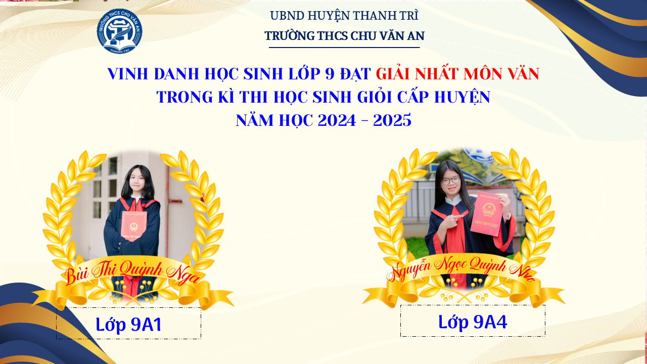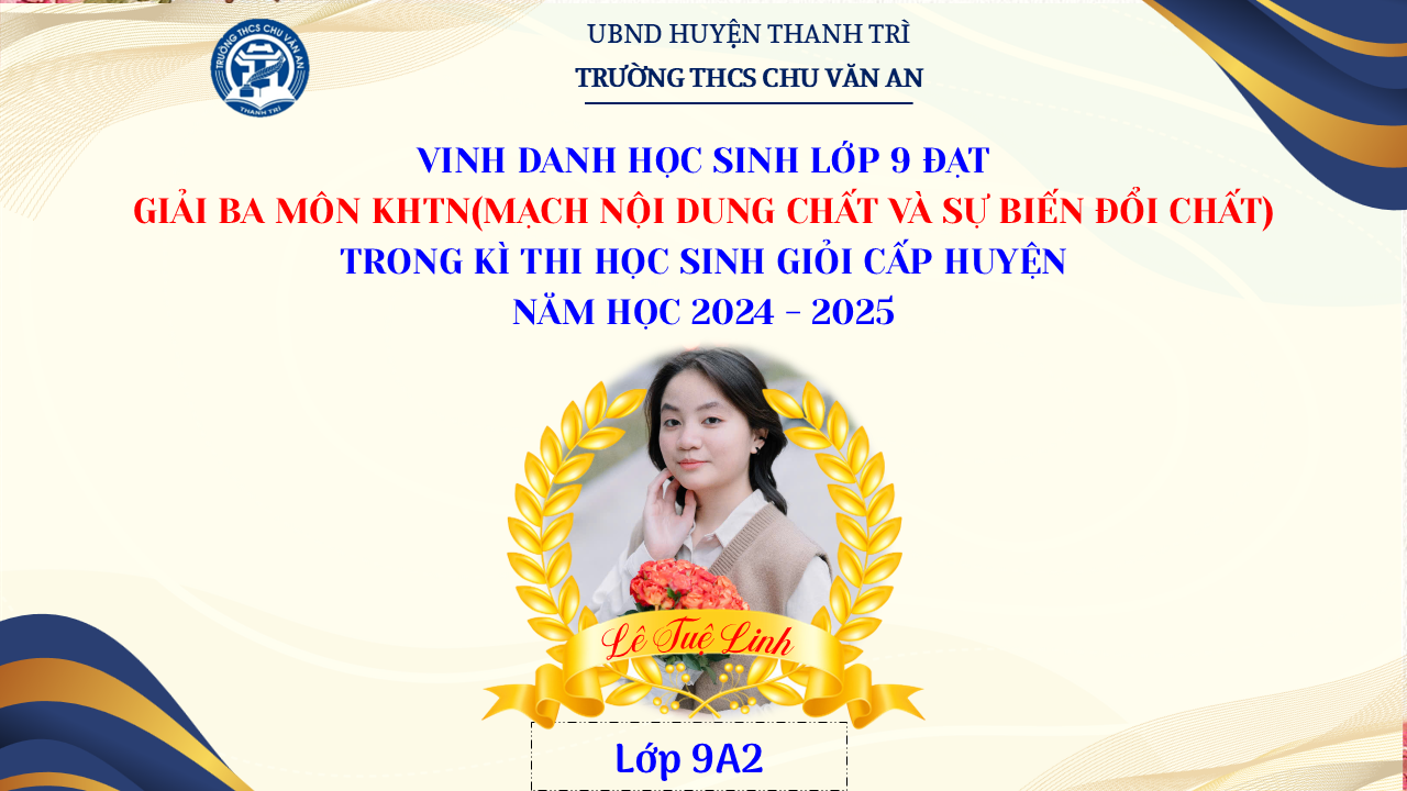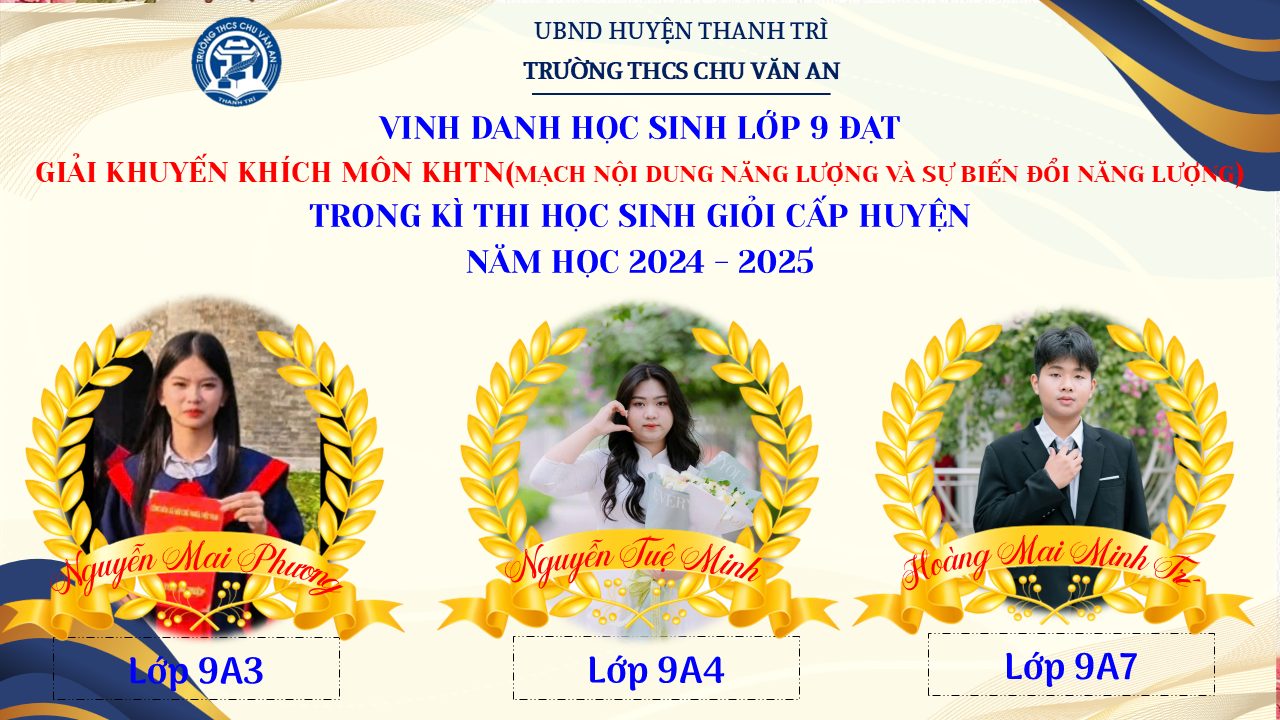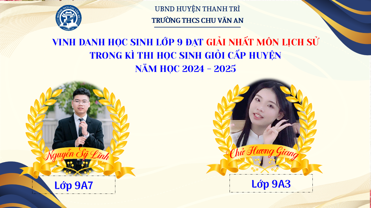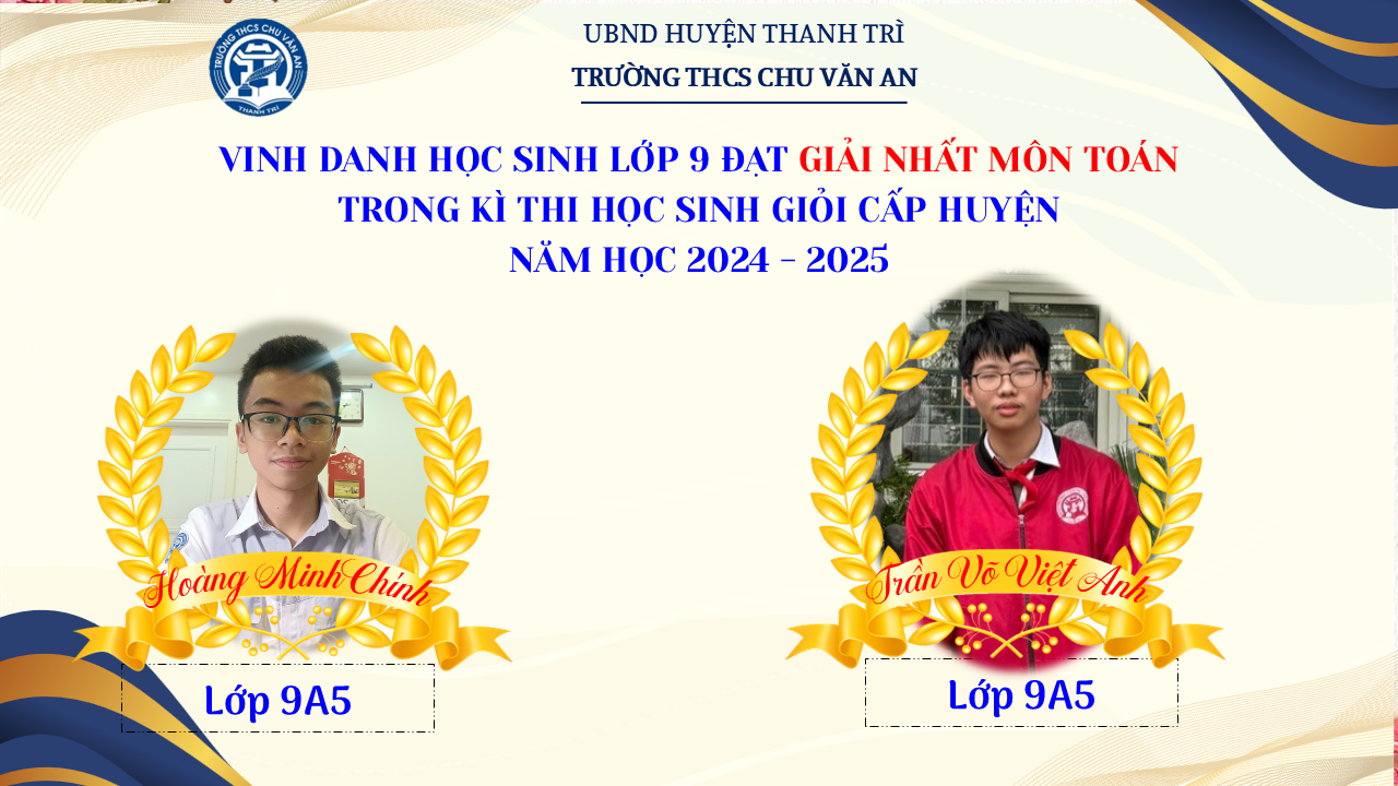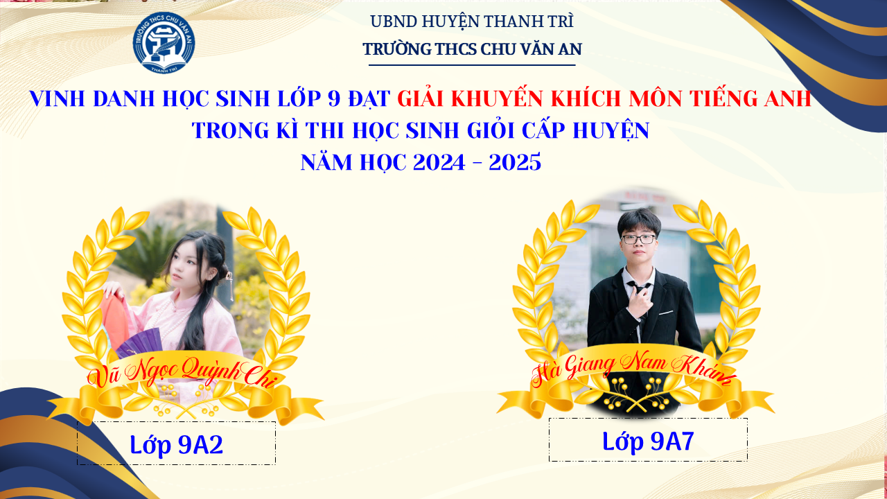 Thật vinh dự khi được chúc mừng 111 học sinh trường THCS Chu Văn An đã xuất sắc đạt giải cao trong kỳ thi học sinh giỏi lớp 9 cấp huyện năm học 2024-2025! 🎉 Thành tích này là kết quả của sự nỗ lực không ngừng nghỉ, lòng say mê học tập và tinh thần quyết tâm của các em; là vụ mùa bội thu dành tặng những người làm vườn cần mẫn trên mảnh vườn tri thức; là món quà dành tặng mẹ cha.