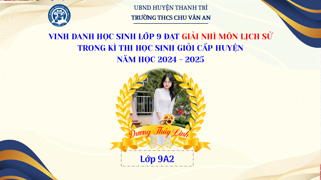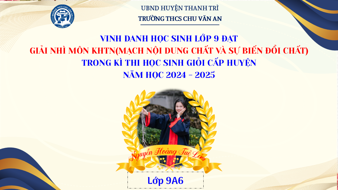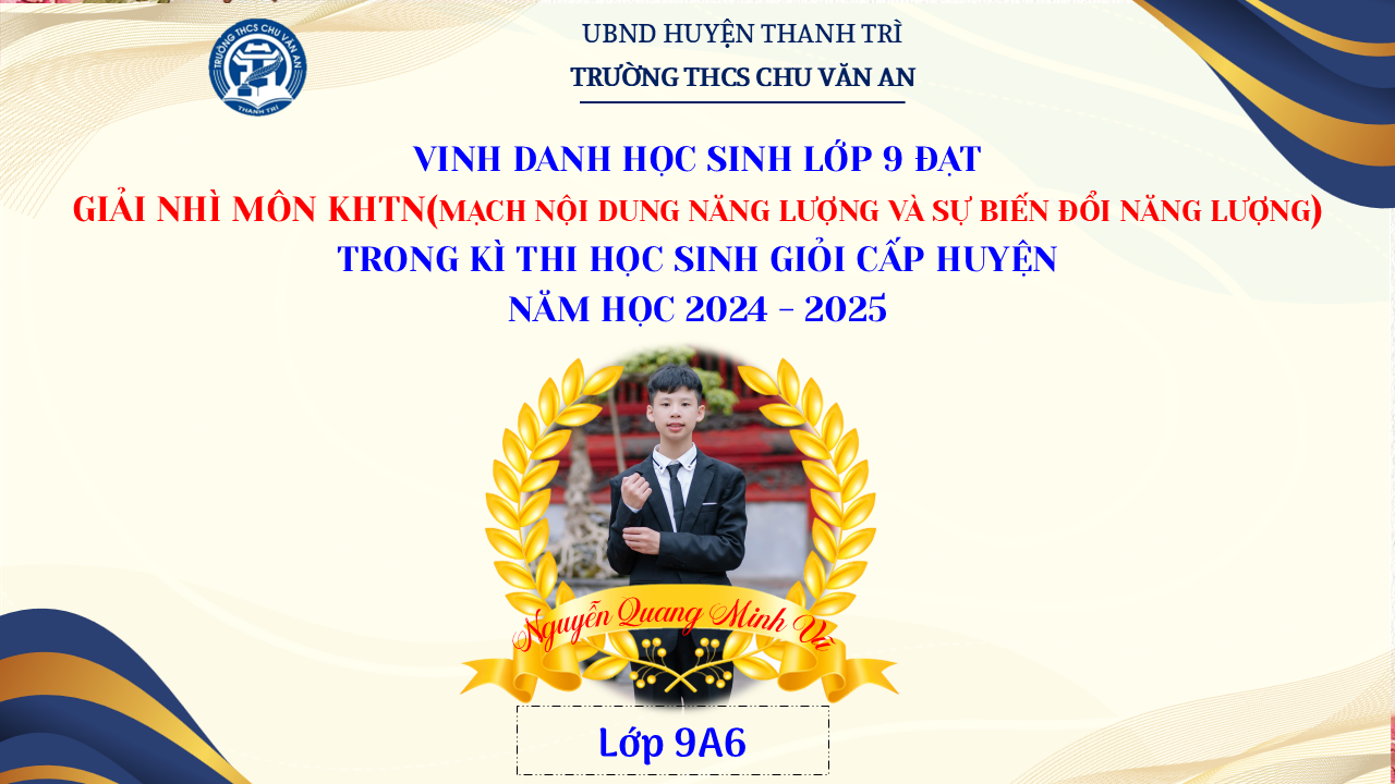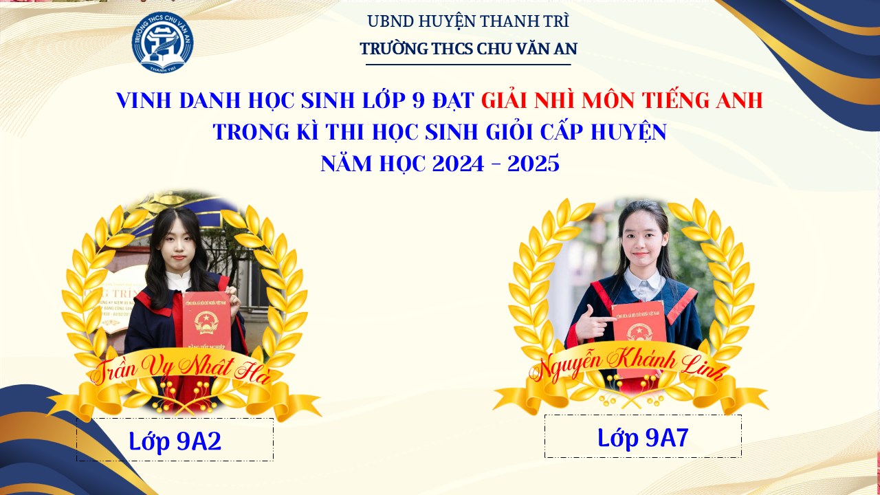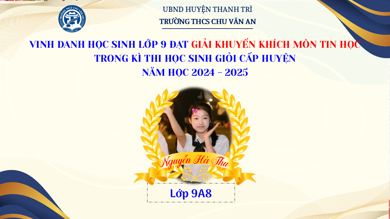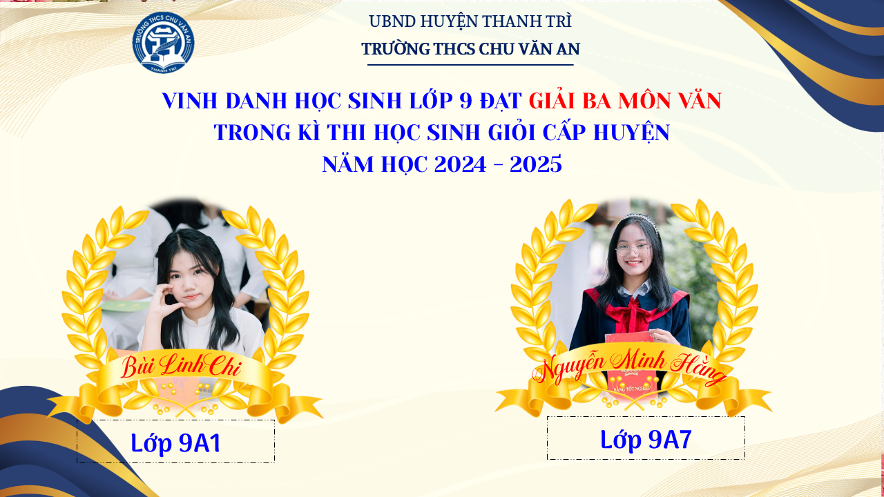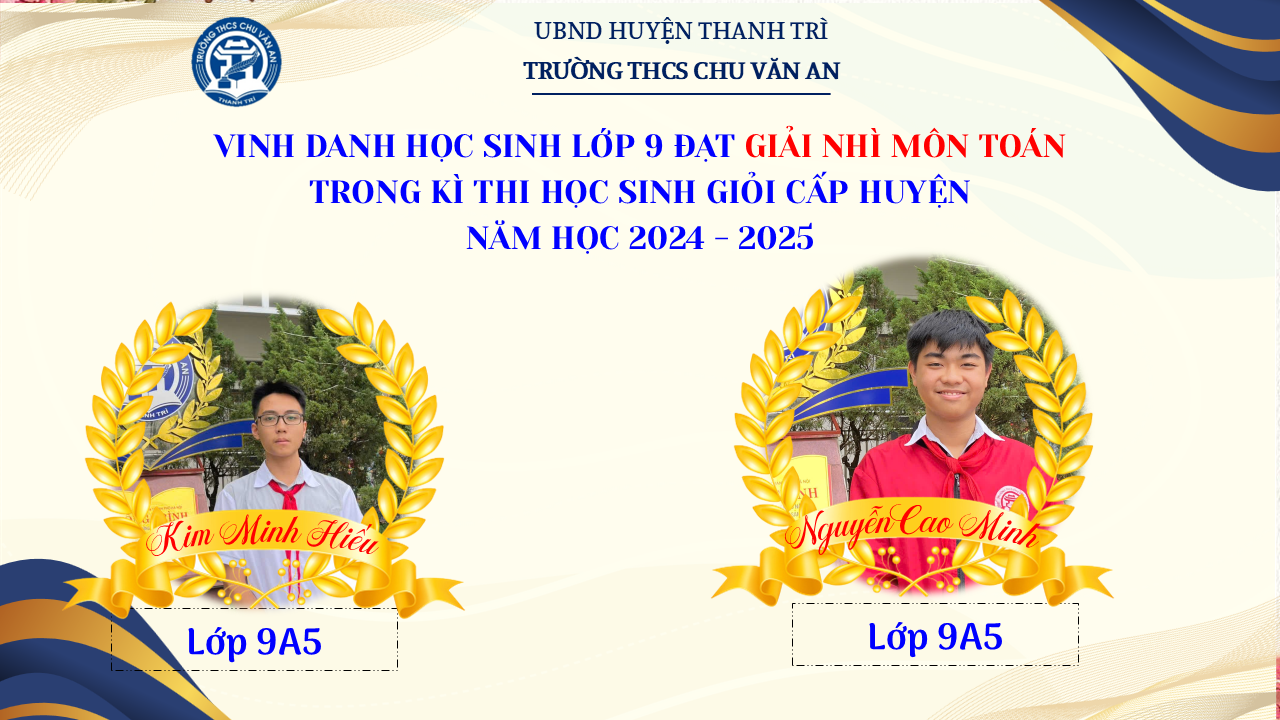 Thật vinh dự khi được chúc mừng 111 học sinh trường THCS Chu Văn An đã xuất sắc đạt giải cao trong kỳ thi học sinh giỏi lớp 9 cấp huyện năm học 2024-2025! 🎉 Thành tích này là kết quả của sự nỗ lực không ngừng nghỉ, lòng say mê học tập và tinh thần quyết tâm của các em; là vụ mùa bội thu dành tặng những người làm vườn cần mẫn trên mảnh vườn tri thức; là món quà dành tặng mẹ cha.